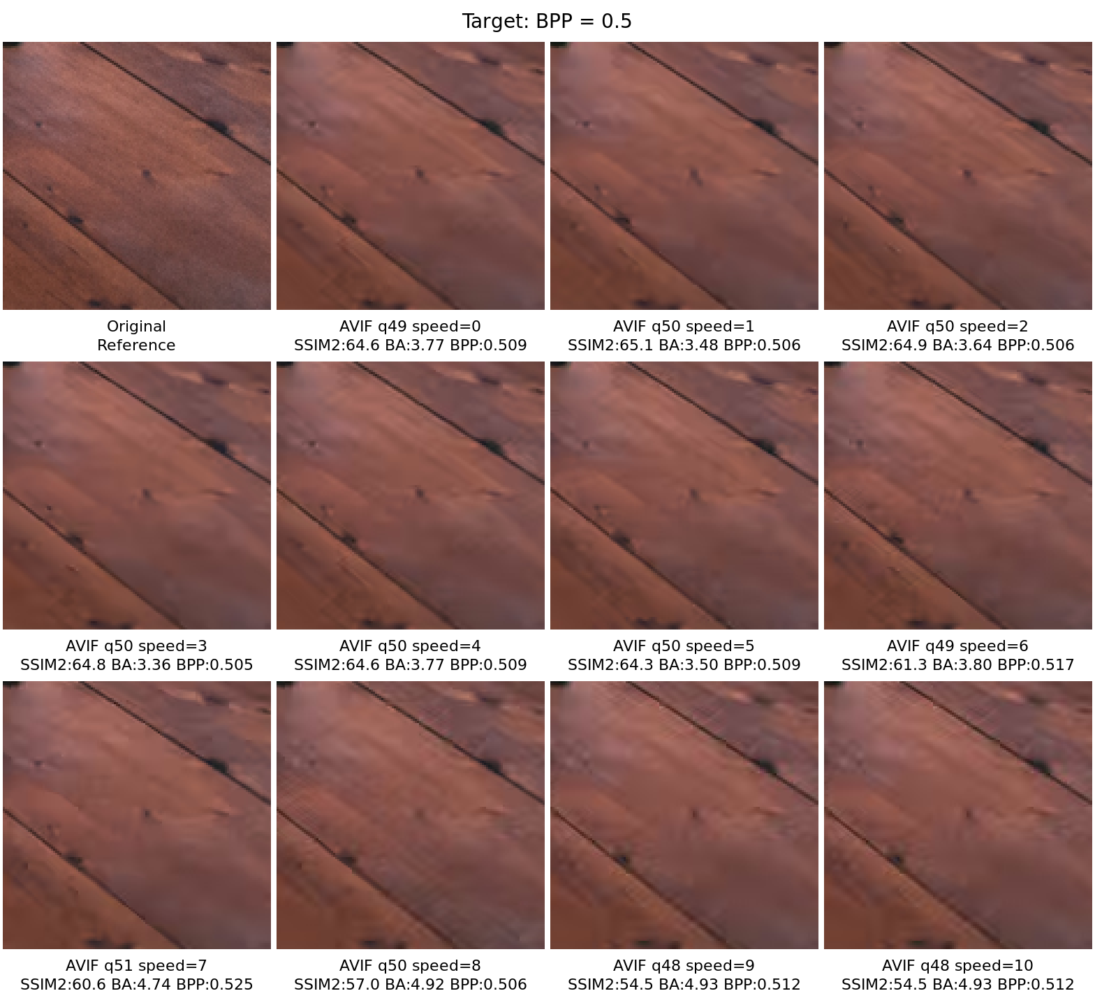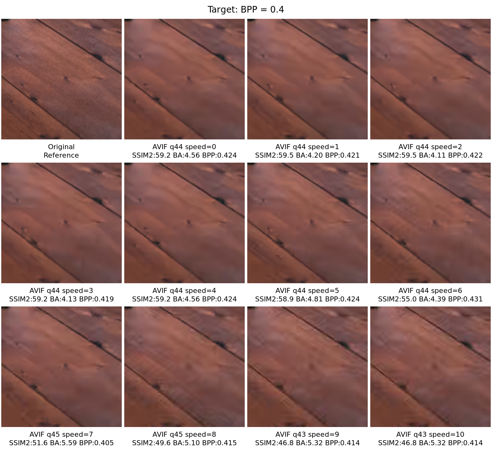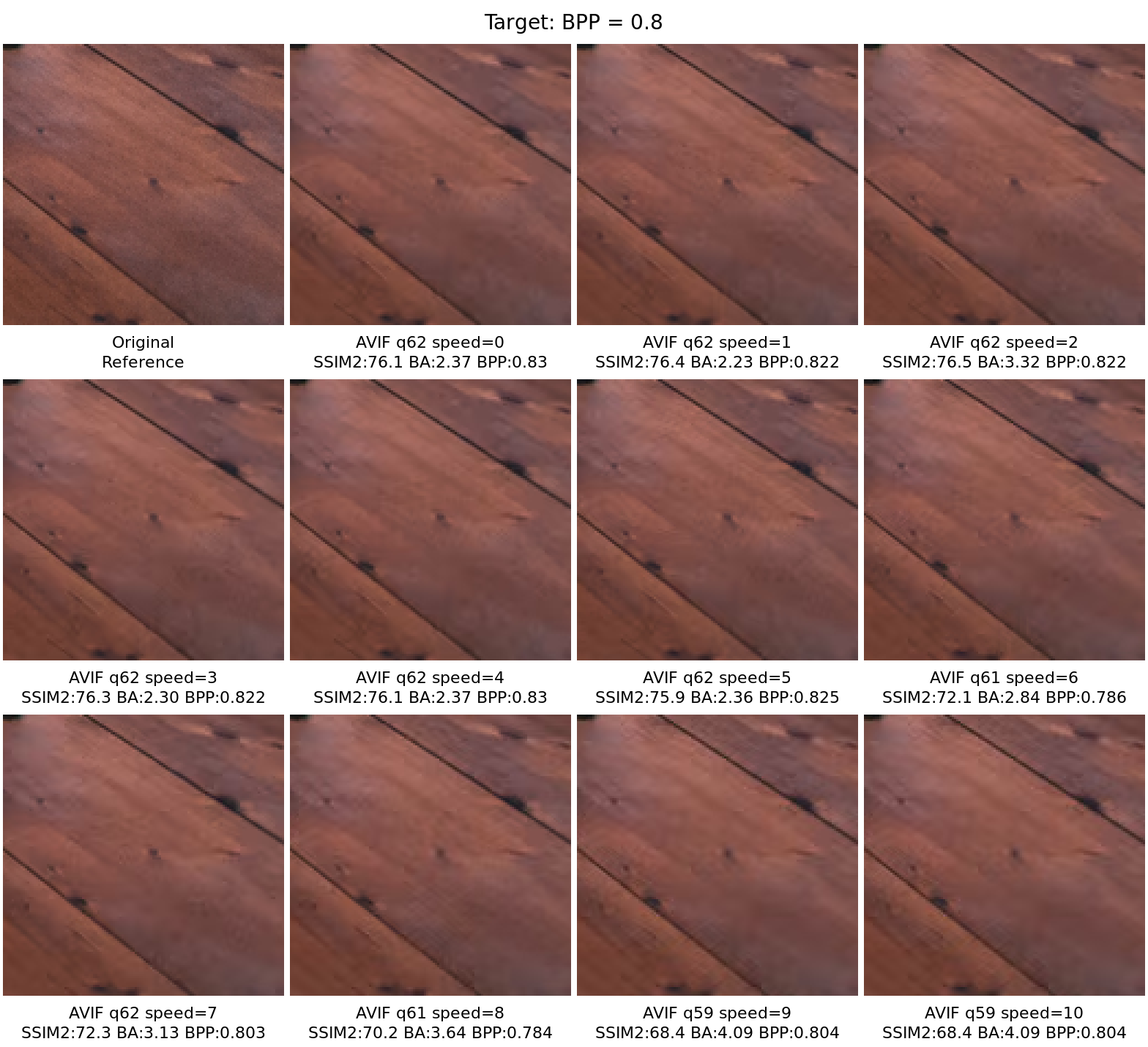 Side-by-side comparison of encoding artifacts on the most representative image fragments, selected automatically from the dataset using Butteraugli spatial distortion analysis. Identifies the image and fragment where the choice of encoding parameters has the greatest anisotropic impact on quality. One fragment is selected per target metric group and shared across all target values within that group for direct comparability. The dashed rectangle marks the fragment used for the comparisons below. Per-pixel anisotropic variance of Butteraugli distortion — bright regions show where quality varies most across tile-parameter values. The variance maps for each target value are averaged to select one fragment for the entire group. Nearest-neighbour 3× zoom of the selected fragment, comparing original against each encoding variant. Images are served losslessly to preserve pixel fidelity. Click any image to open it in the lightbox viewer. Per-variant Butteraugli distortion maps shown as viridis heatmaps at uniform scale (darker = higher distortion). Reveals where each encoder concentrates its errors. The dashed rectangle marks the fragment used for the comparisons below. Per-pixel anisotropic variance of Butteraugli distortion — bright regions show where quality varies most across tile-parameter values. The variance maps for each target value are averaged to select one fragment for the entire group. Nearest-neighbour 3× zoom of the selected fragment, comparing original against each encoding variant. Images are served losslessly to preserve pixel fidelity. Click any image to open it in the lightbox viewer. Per-variant Butteraugli distortion maps shown as viridis heatmaps at uniform scale (darker = higher distortion). Reveals where each encoder concentrates its errors. The dashed rectangle marks the fragment used for the comparisons below. Per-pixel anisotropic variance of Butteraugli distortion — bright regions show where quality varies most across tile-parameter values. The variance maps for each target value are averaged to select one fragment for the entire group. Nearest-neighbour 3× zoom of the selected fragment, comparing original against each encoding variant. Images are served losslessly to preserve pixel fidelity. Click any image to open it in the lightbox viewer. Per-variant Butteraugli distortion maps shown as viridis heatmaps at uniform scale (darker = higher distortion). Reveals where each encoder concentrates its errors.Anisotropic Variance Analysis