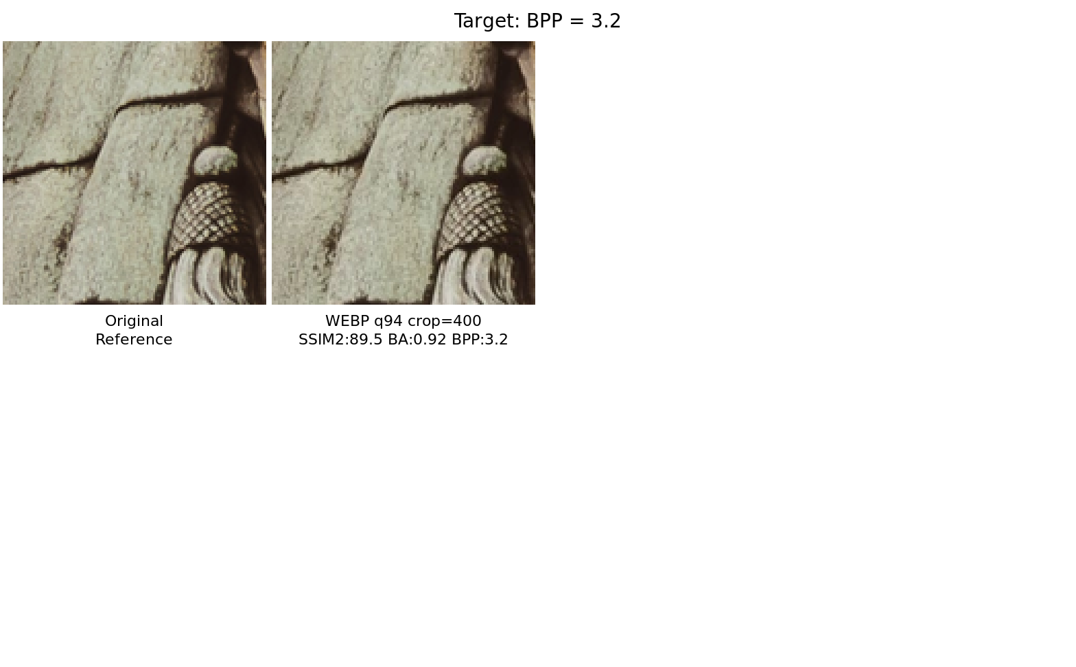 Side-by-side comparison of encoding artifacts on the most representative image fragments, selected automatically from the dataset using Butteraugli spatial distortion analysis. Identifies the image and fragment where the choice of encoding parameters has the greatest anisotropic impact on quality. One fragment is selected per target metric group and shared across all target values within that group for direct comparability. The dashed rectangle marks the fragment used for the comparisons below. Per-pixel anisotropic variance of Butteraugli distortion — bright regions show where quality varies most across tile-parameter values. The variance maps for each target value are averaged to select one fragment for the entire group. Nearest-neighbour 3× zoom of the selected fragment, comparing original against each encoding variant. Images are served losslessly to preserve pixel fidelity. Click any image to open it in the lightbox viewer. Per-variant Butteraugli distortion maps shown as viridis heatmaps at uniform scale (darker = higher distortion). Reveals where each encoder concentrates its errors. The dashed rectangle marks the fragment used for the comparisons below. Per-pixel anisotropic variance of Butteraugli distortion — bright regions show where quality varies most across tile-parameter values. The variance maps for each target value are averaged to select one fragment for the entire group. Nearest-neighbour 3× zoom of the selected fragment, comparing original against each encoding variant. Images are served losslessly to preserve pixel fidelity. Click any image to open it in the lightbox viewer. Per-variant Butteraugli distortion maps shown as viridis heatmaps at uniform scale (darker = higher distortion). Reveals where each encoder concentrates its errors. The dashed rectangle marks the fragment used for the comparisons below. Per-pixel anisotropic variance of Butteraugli distortion — bright regions show where quality varies most across tile-parameter values. The variance maps for each target value are averaged to select one fragment for the entire group. Nearest-neighbour 3× zoom of the selected fragment, comparing original against each encoding variant. Images are served losslessly to preserve pixel fidelity. Click any image to open it in the lightbox viewer. Per-variant Butteraugli distortion maps shown as viridis heatmaps at uniform scale (darker = higher distortion). Reveals where each encoder concentrates its errors.Anisotropic Variance Analysis